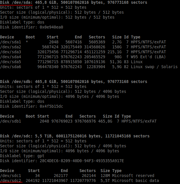 Based on capacity of media, we know that external HD is represented by: /dev/sdc disk. (5,5 TiB)